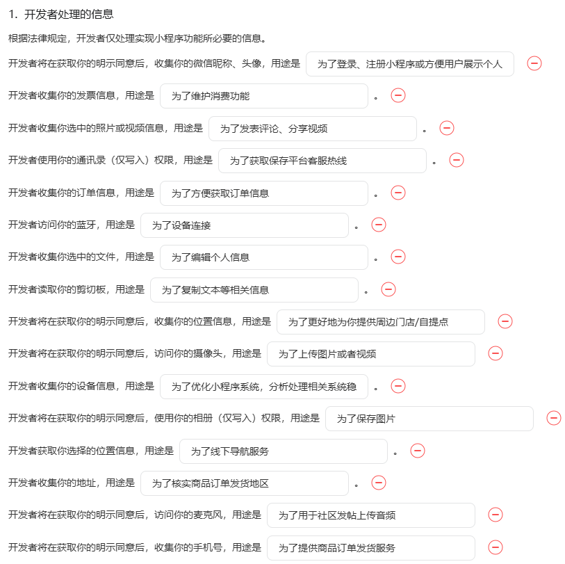 隐私协议内容类型有:用户信息(微信头像和昵称)必选,不然会影响小程序点击授权登录无反应、位置信息、地址、发票信息、麦克风、选中的照片或视频信息、摄像头、手机号、通讯录(仅写入)权限、设备信息、订单信息、相册(仅写入)权限、蓝牙、选中的文件、选择的位置信息、剪切板等,这些需要对应填写好内容。